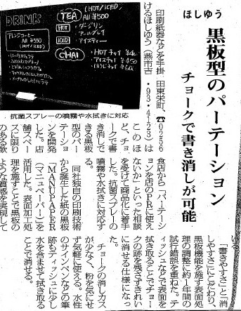 NEWS 包装タイムズ10/12 NEWS 2020/10/12 包装タイムズに「紙の黒板でできたテーブルパーテーション」を掲載いただきました。 日報ビジネスさま、いつもありがとうございます。 ▼プレスリリース プレスリリース_黒板P 一覧に戻る